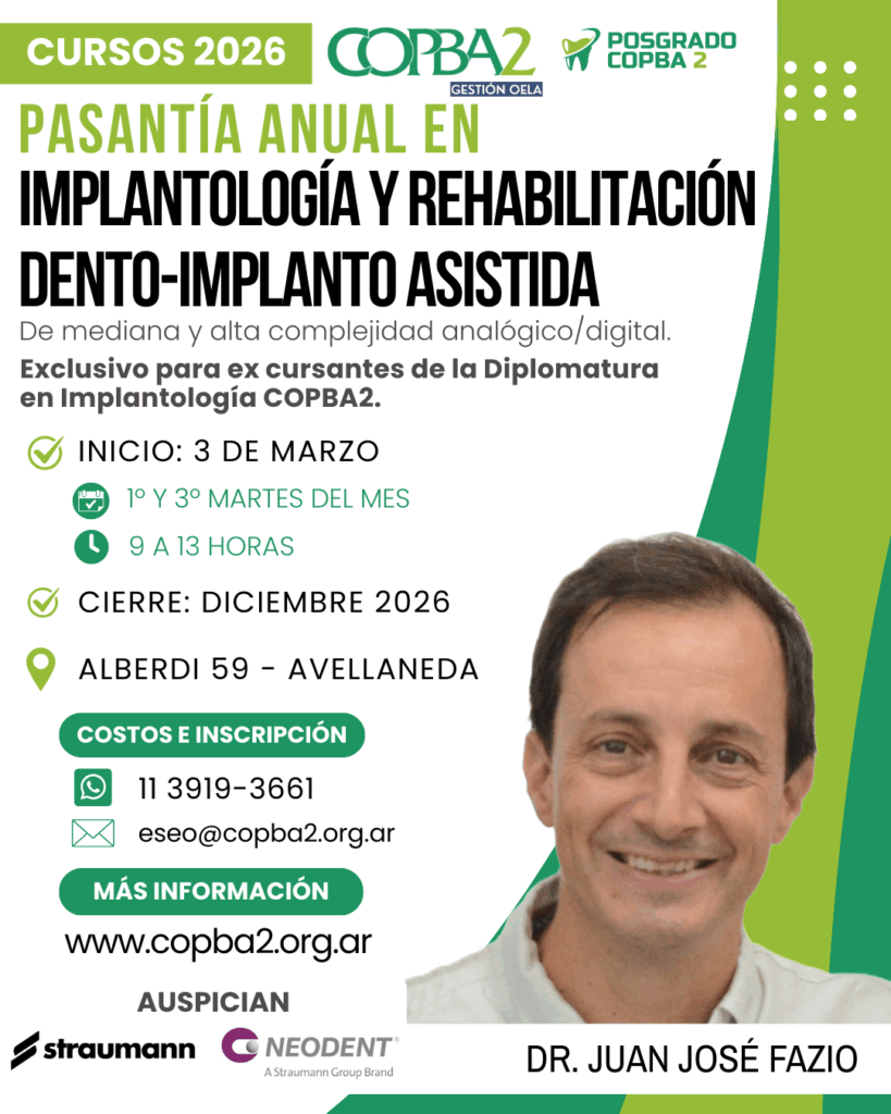 El Colegio de Odontólogos de la Provincia de Buenos Aires Distrito II (COPBA2) abre la convocatoria para un nuevo año de la Escuela de Posgrado con una renovada oferta de Cursos de especialización en las Clínicas del Colegio. En este caso, se trata de la “Diplomatura en Implantología de baja, mediana y alta complejidad”, a cargo […]
