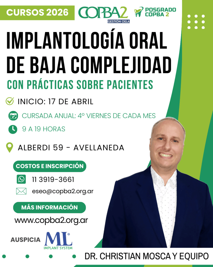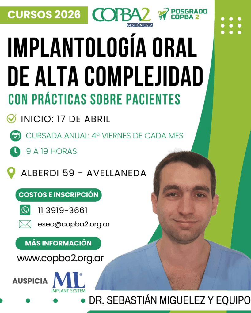 El Colegio de Odontólogos de la Provincia de Buenos Aires Distrito II (COPBA2) abre la convocatoria para un nuevo año de la Escuela de Posgrado con una renovada oferta de Cursos de especialización en las Clínicas del Colegio. En este caso, se trata de la “Diplomatura en Implantología de baja, mediana y alta complejidad”, a cargo […]