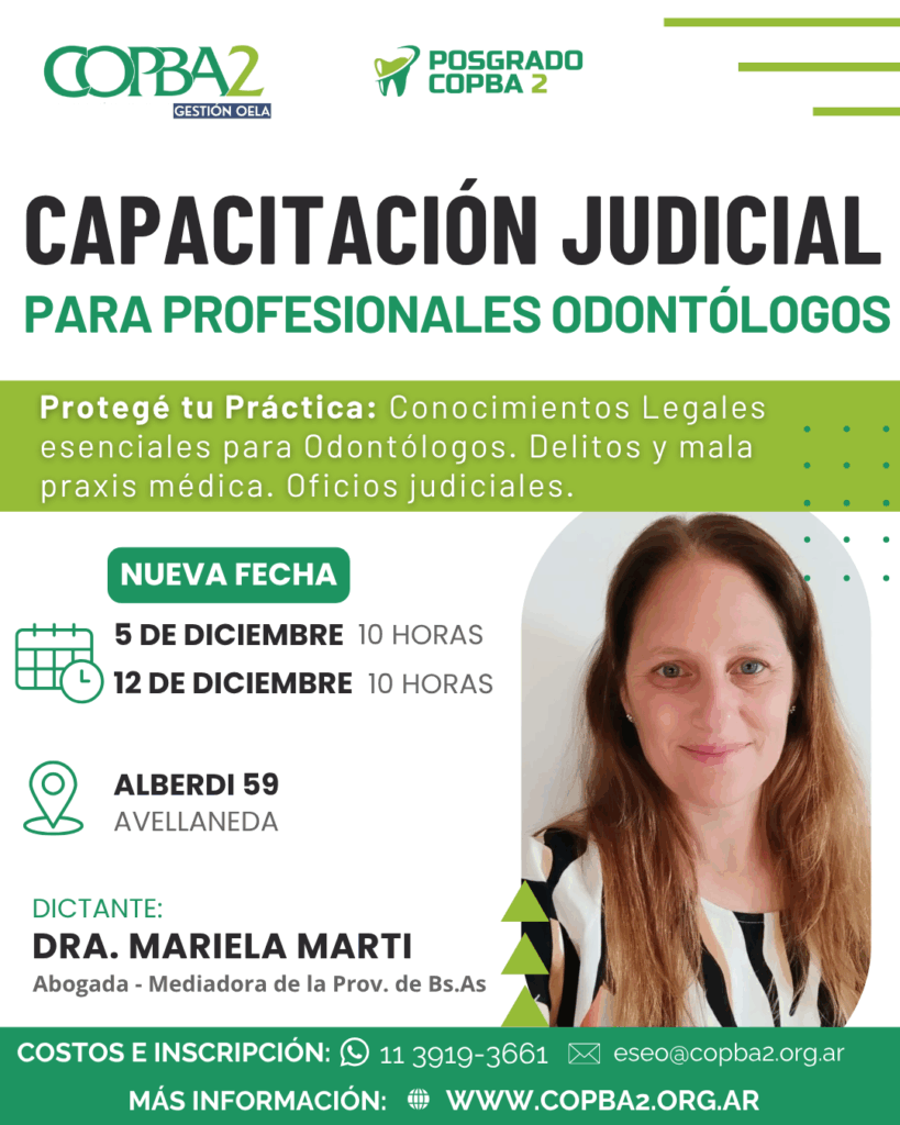 El Colegio de Odontólogos de la Provincia de Buenos Aires Distrito II (COPBA2) avanza en un nuevo año de la Escuela de Posgrado con una variada oferta de Cursos de especialización en las instalaciones de la Clínica del Colegio ubicada Alberdi 59, Avellaneda. En esta oportunidad, se trata de una Capacitación Judicial para profesionales odontólogos: […]