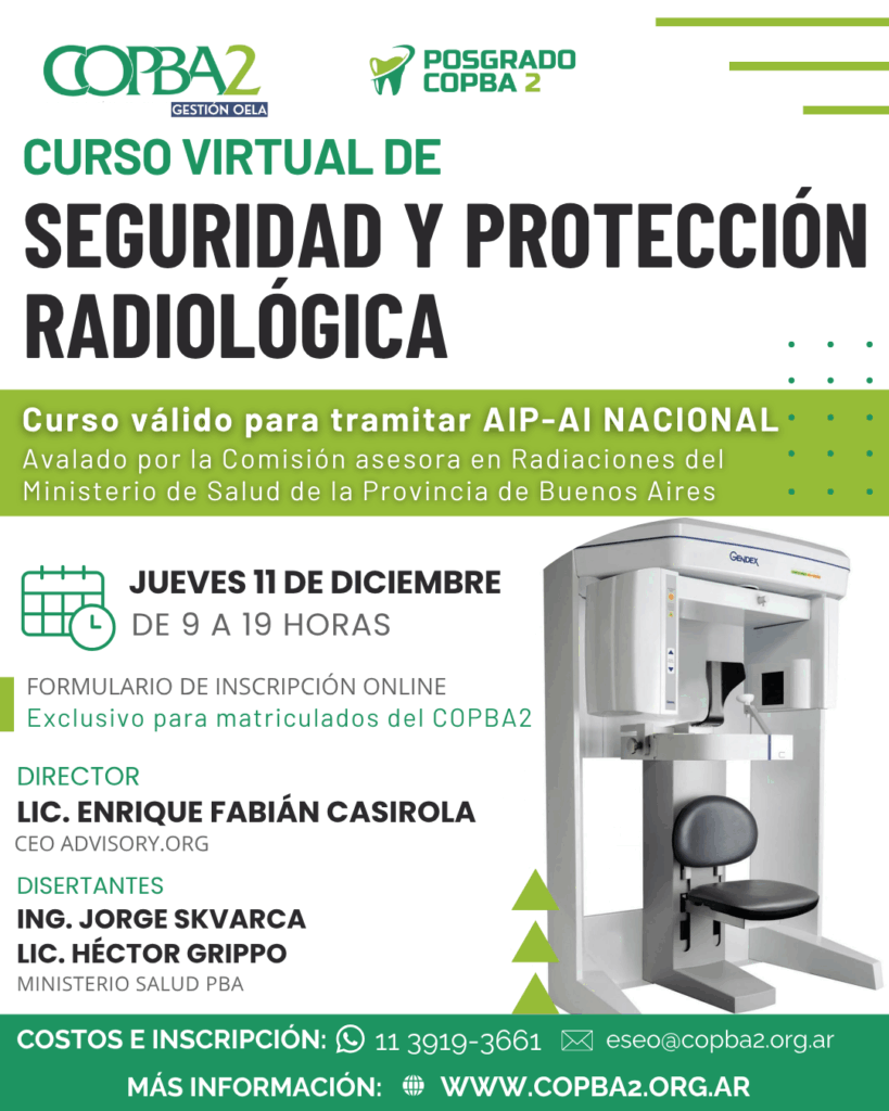 El Colegio de Odontólogos de la Provincia de Buenos Aires Distrito II (COPBA2) ofrece a sus matriculados una nueva edición del Curso de Seguridad y Protección Radiológica de modalidad virtual sincrónica, con evaluación y entrega de certificado válido para tramitar el AIP-AI NACIONAL. La especialización estará a cargo de un equipo de disertantes especializados y se realizará […]