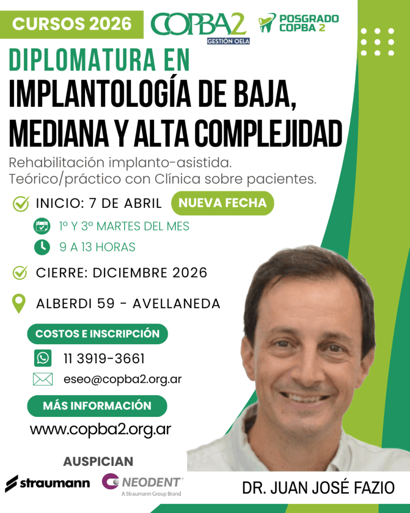 El Colegio de Odontólogos de la Provincia de Buenos Aires Distrito II (COPBA2) abre la convocatoria para un nuevo año de la Escuela de Posgrado con una renovada oferta de Cursos de especialización en las Clínicas del Colegio. En este caso, se trata de la “Diplomatura en Implantología de baja, mediana y alta complejidad”, a cargo […]