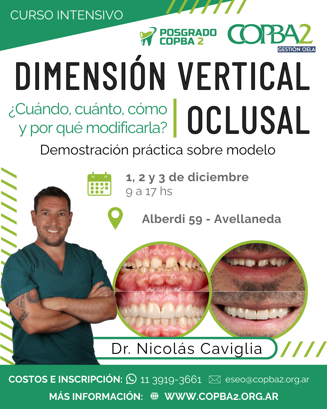 En este caso, se trata del Curso intensivo de Posgrado sobre «Dimensión Vertical Oclusal: ¿Cuándo, cuánto, cómo y por qué modificarla?», a cargo del especialista Dr. Nicolás Caviglia. El curso, que tendrá demostración práctica sobre modelo, se desarrollará los días 1,2 y 3 de diciembre de 9 a 17 horas, en la sede de nuestra institución (Alberdi 59-Avellaneda).