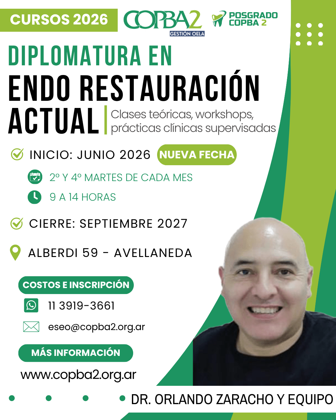 En este caso, se trata de la Diplomatura en Endo Restauración actual, a cargo del Dr. Orlando Zaracho y su equipo de dictantes. El curso iniciará en junio de 2026 y se cursará los segundos y cuartos martes de cada mes, de 9 a 14 horas, con finalización en septiembre de 2027. La especialización contará con clases teóricas, workshops y prácticas clínicas supervisadas.