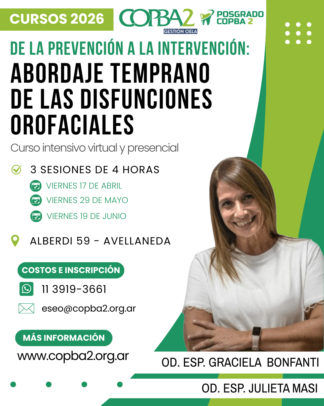 En este caso, se trata del curso «De la prevención a la intervención: abordaje temprano de las Disfunciones Orofaciales», a cargo de las especialistas Od. Graciela Bonfanti y la Od. Julieta Masi. El curso intensivo virtual y presencial se realizará a lo largo de 3 sesiones, con inicio el viernes 17 de abril.