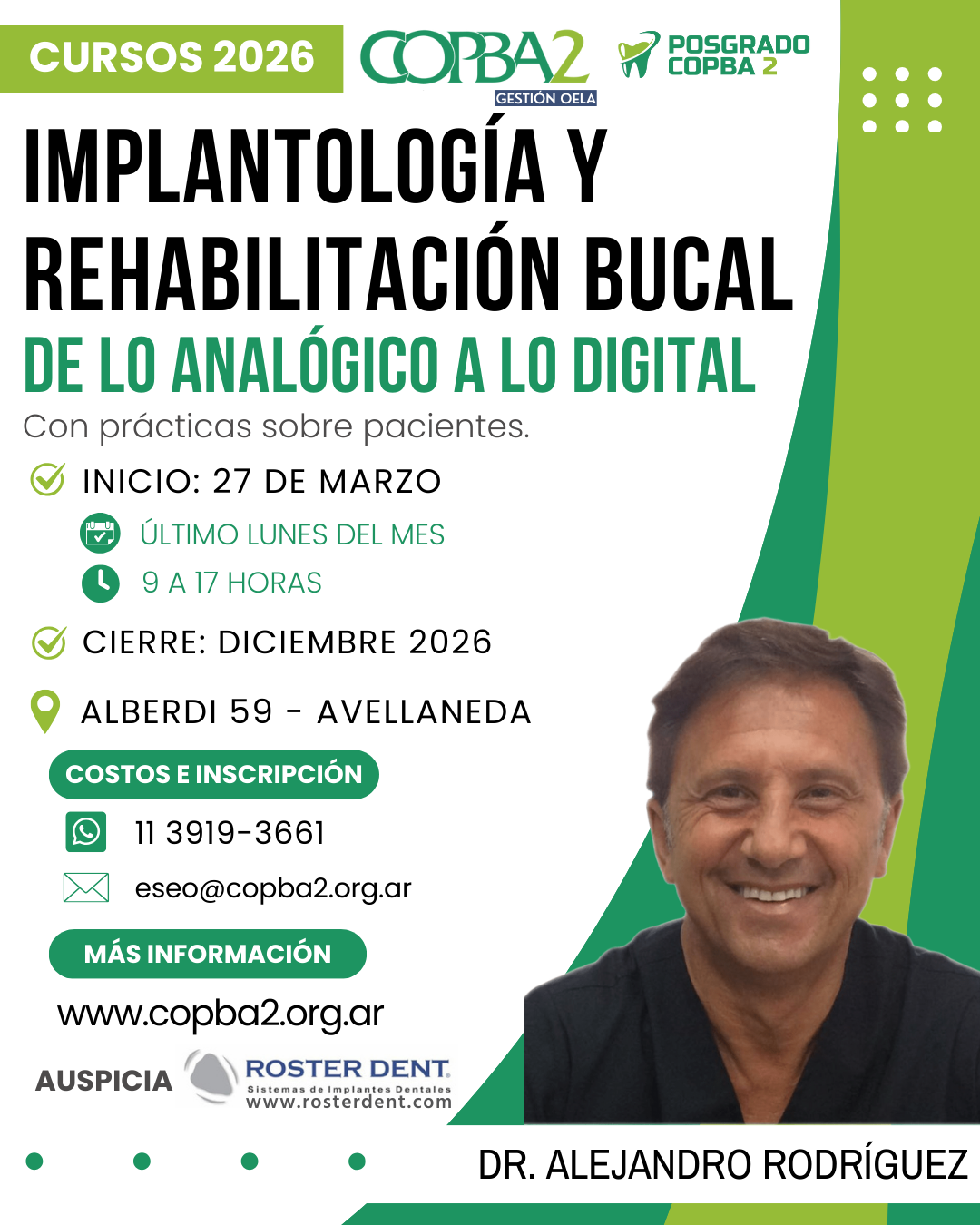 En este caso, se trata del curso «Implantología y Rehabilitación Bucal: de lo analógico a lo digital», a cargo del Dr. Alejandro Rodríguez. El curso iniciará el viernes 27 de marzo y se cursará el últimos lunes de cada mes, de 9 a17 horas. La especialización, que se realiza con el apoyo de la empresa Roster Dent, contará con prácticas sobre pacientes.