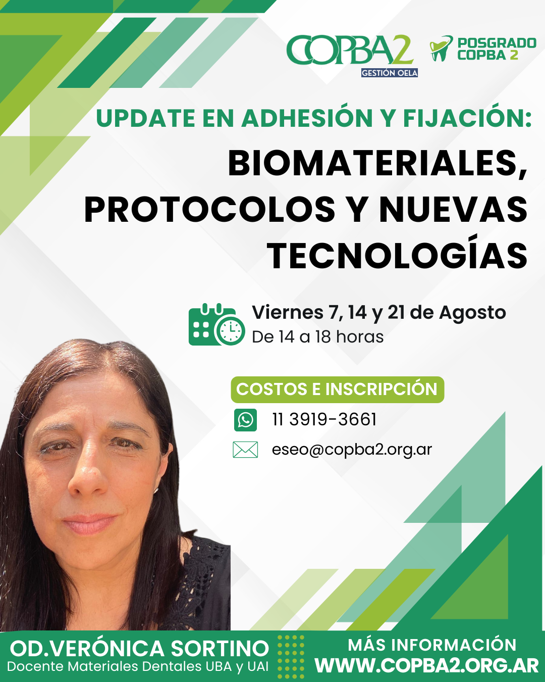 En este caso, se trata de una de actualización profesional en adhesión y fijación bajo la temática: «Biomateriales, protocolos y nuevas tecnologías», a cargo de la especialista Od. Verónica Sortino.