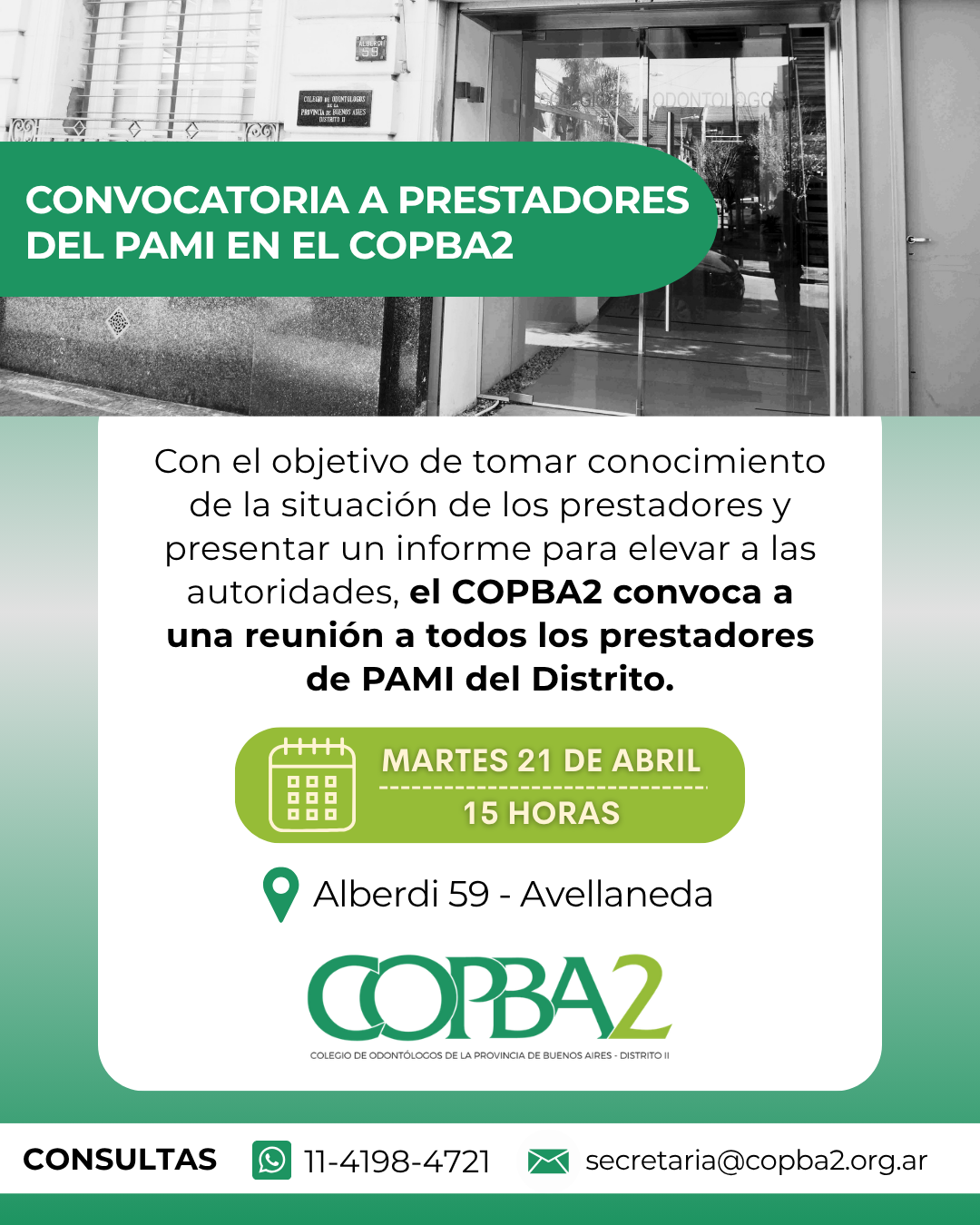 En esta dirección, es que el COPBA2 convoca a una reunión a todos los prestadores del PAMI del Distrito, con el objetivo de tomar conocimiento de su situación y presentar un informe para elevar a las autoridades. El encuentro se realizará el próximo martes 21 de abril, a las 15 horas, en nuestra institución (Alberdi 59- Avellaneda).