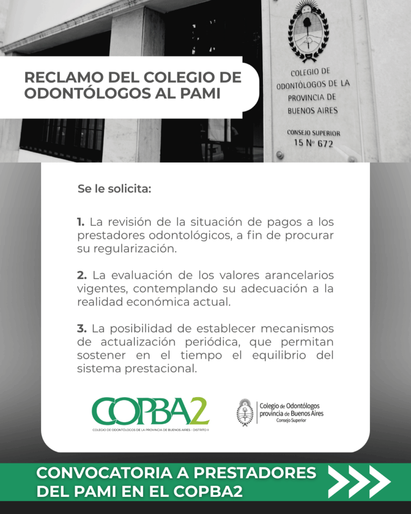 El Consejo Superior del Colegio de Odontólogos de la Provincia de Buenos Aires (COSUCOBA) formalizó un reclamo ante el PAMI por la situación que atraviesan los odontólogos prestadores en la Provincia.