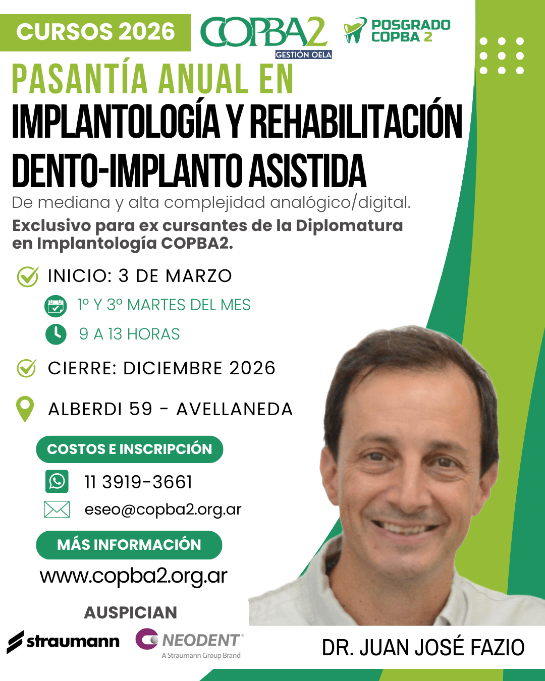 En este caso, se trata de la «Pasantía anual en Implantología y rehabilitación dento-implanto asistida”, a cargo del Dr. Juan José Fazio. La especialización tendrá fecha de inicio el 3 de marzo y tendrá una duración anual, cursándose los primeros y terceros martes de cada mes, de 9 a 13 horas en el Colegio. Este curso es exclusivo para ex cursantes de la Diplomatura en Implantología del COPBA2.