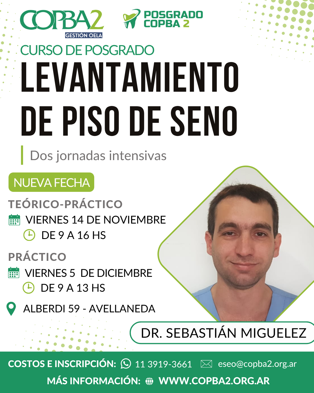 En este caso, se trata de un Curso de Levantamiento de Piso de Seno, a cargo del Dr. Sebastián Miguelez. La especialización contará con dos jornadas intensivas, a desarrollarse el viernes 14 de noviembre, de 9 a 16 hs, y el viernes 5 de diciembre, de 9 a 13 hs, en la sede de nuestra institución.