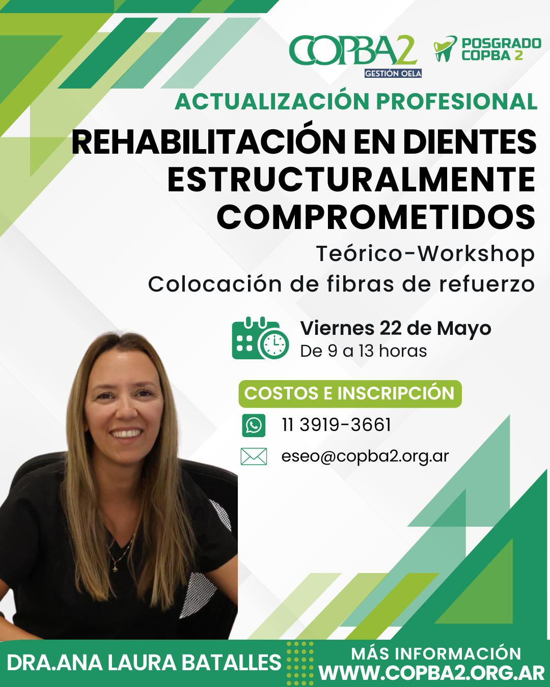 En este caso, se trata de una jornada de actualización profesional bajo la temática: «Rehabilitación en dientes estructuralmente comprometidos», a cargo de la especialista Dra. Ana Laura Batalles.