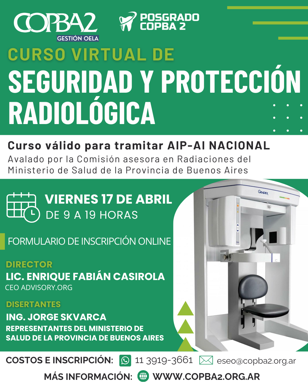 El Colegio de Odontólogos de la Provincia de Buenos Aires Distrito II (COPBA2) ofrece a sus matriculados una nueva edición del Curso de Seguridad y Protección Radiológica de modalidad virtual sincrónica, con evaluación y entrega de certificado válido para tramitar el AIP-AI NACIONAL. La especialización estará a cargo de un equipo de disertantes especializados y se realizará el viernes 17 de abril de 9 a 19 horas, de manera virtual.